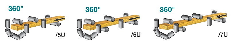 Станок данной серии выпускается с 5,6,7 шпинделями. Последовательность расположения шпинделей следующая:G240/5U – 1-й нижний строгальный, 2-ой правый фрезерный, 3-ий левый фрезерный, 4-ый верхний фрезерный (профилирующий), 5-ый универсальный на 360 градусов;