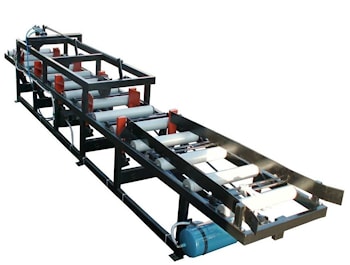 Колоды подаются в станок призматическим рольгангом (ускорителем), на котором автоматически центрируются и догоняют предыдущую колоду.