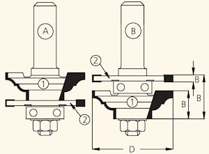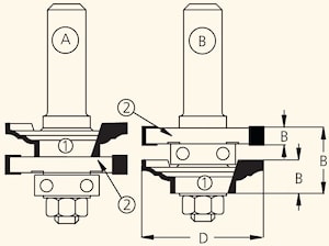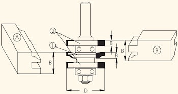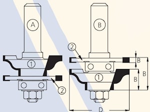 Комплект фрез серии RGD2 состоит из оправки с гайкой NHRG822 или 5, одной профильной фрезы, двух пазовых фрез и ведущих подшипников. Достаточно один раз собрать фрезу и путем изменения высоты относительно обрабатываемой заготовки, фрезеровать обе части соединения профиль и контрпрофиль A и B.