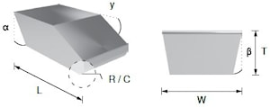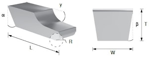 | L (мм) | W - min (мм) | W - max (мм) | T (мм) | α (°) | β (°) | ƴ (°) | r (мм) |