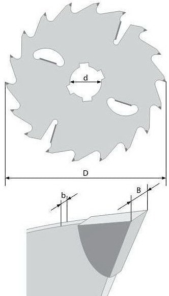 D - наружный диаметр дисковой пилы, B - ширина режущего зуба пилы, d - посадочный диаметр пилы
